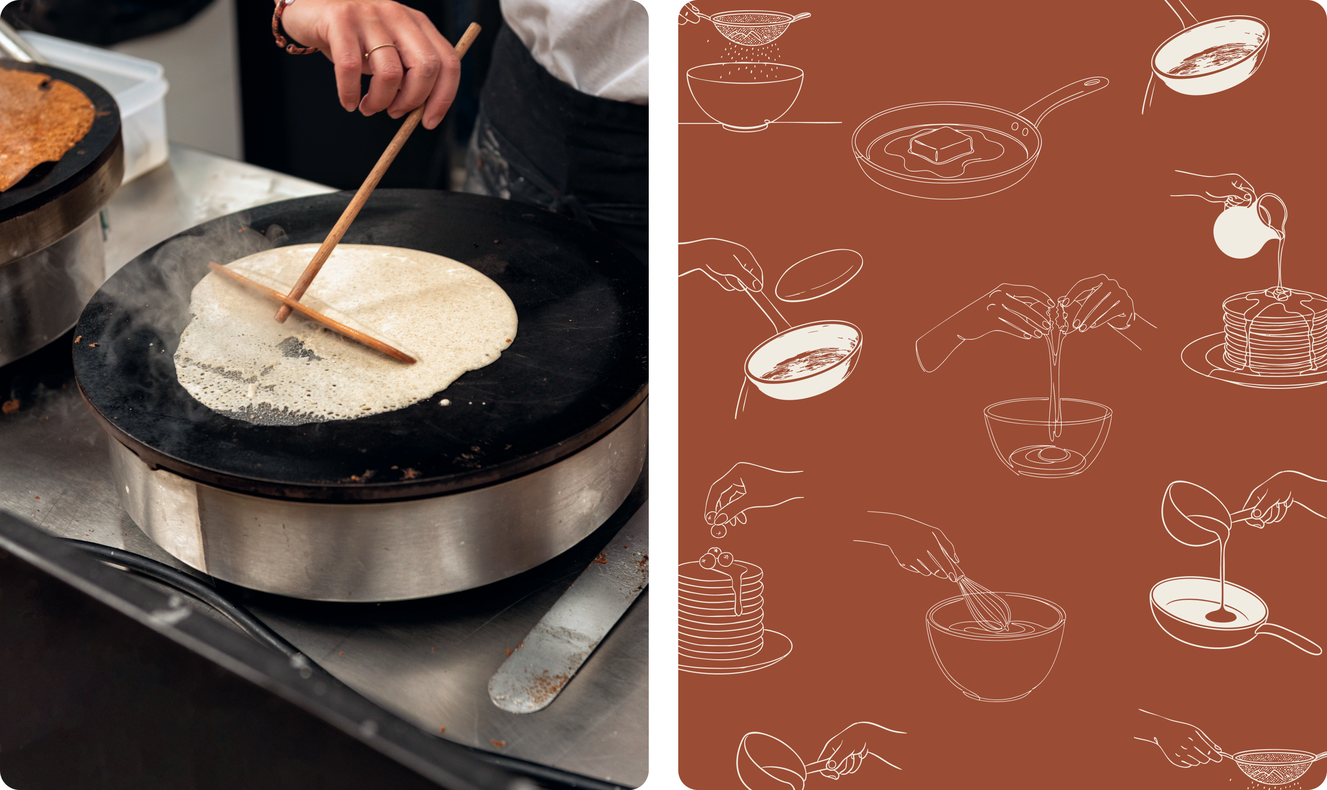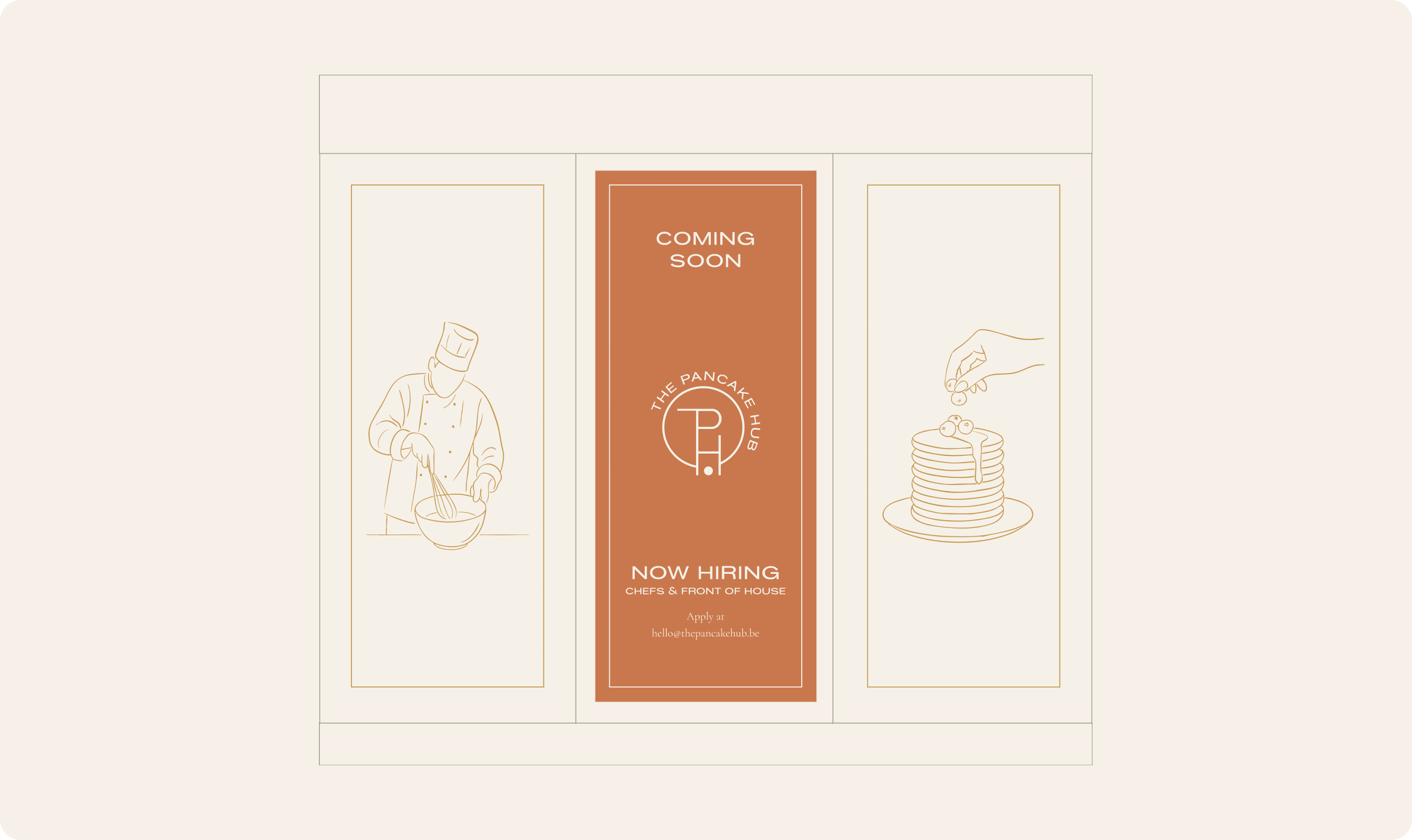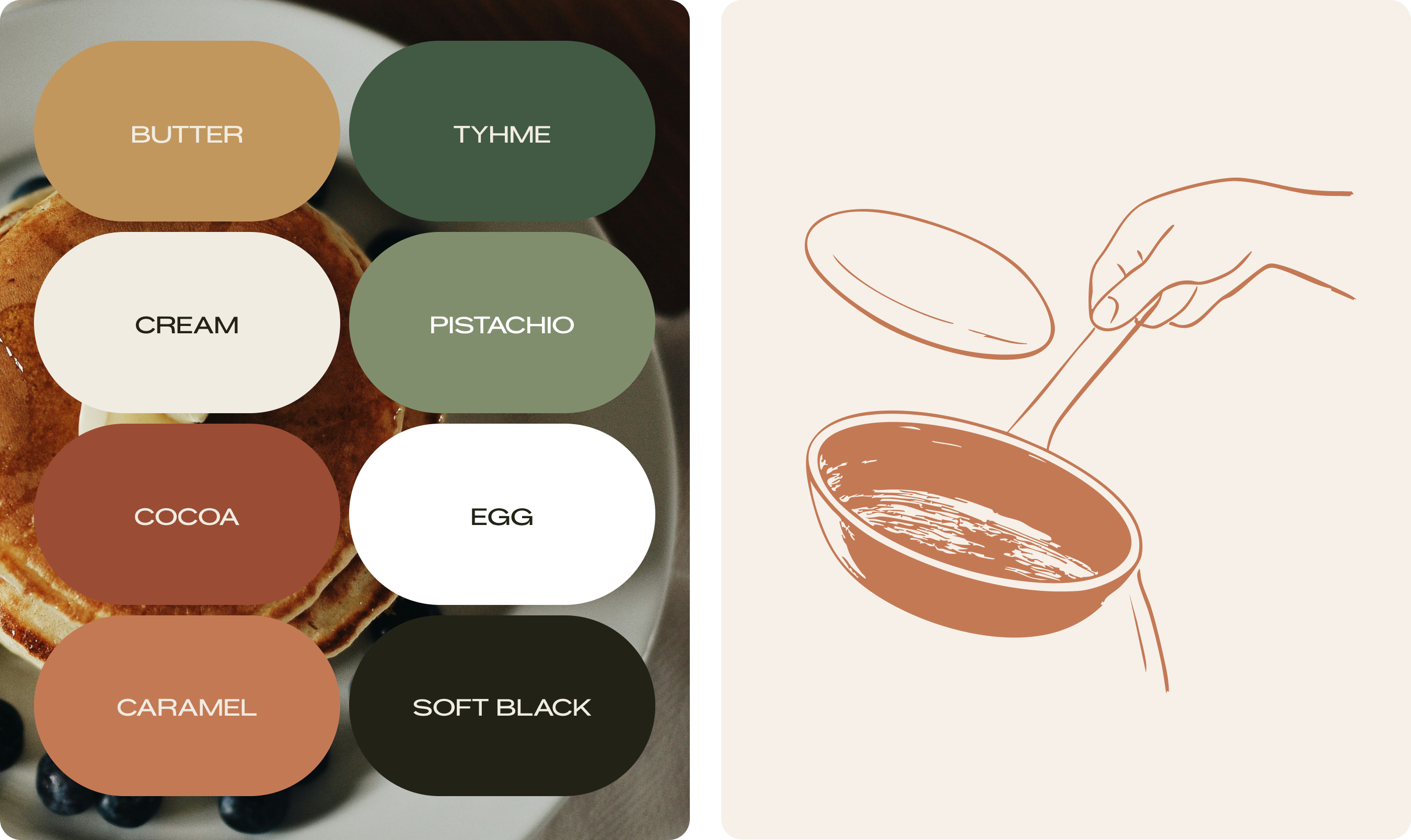 Om de branding echt te laten spreken, hebben we inspiratie gehaald uit de keuken voor het kleurenpalet. ‘Butter’, ‘Cream’ en ‘Caramel’ roepen associaties op met ahornsiroop, bloem en goudgeel gebakken pancakes, terwijl diepe groentinten zoals ‘Thyme’ zorgen voor een natuurlijk en kwalitatief contrast. Deze visuele warmte wordt ondersteund door een mix van de strakke Konstant Grotesk voor headlines en de elegante Cormorant voor de bodytekst. Van de menukaarten en handgetekende illustraties tot de raamstickers in de Antwerpse binnenstad; elk element dat we hebben uitgewerkt draagt bij aan een consistente beleving die laat zien dat hier met aandacht voor detail wordt gewerkt.