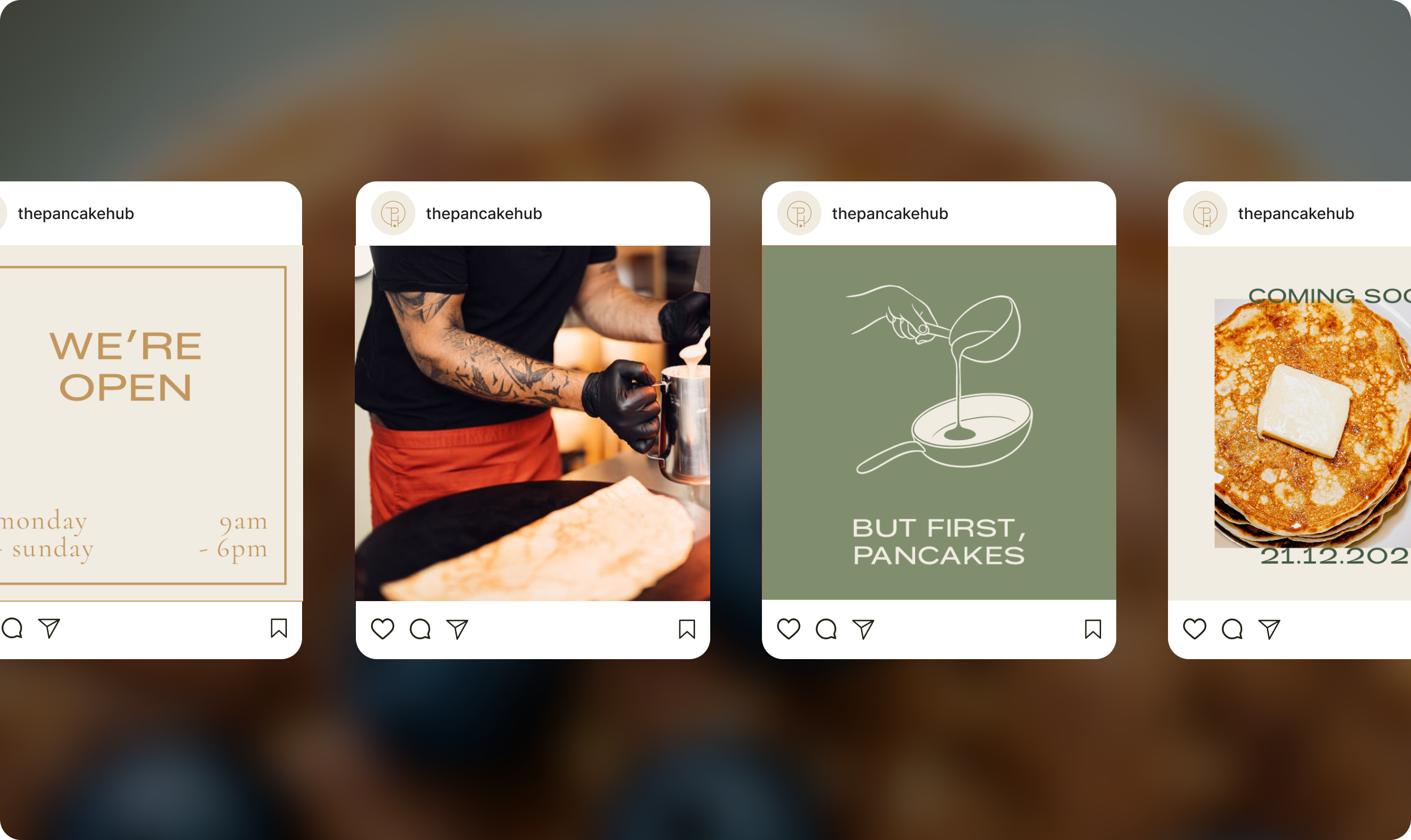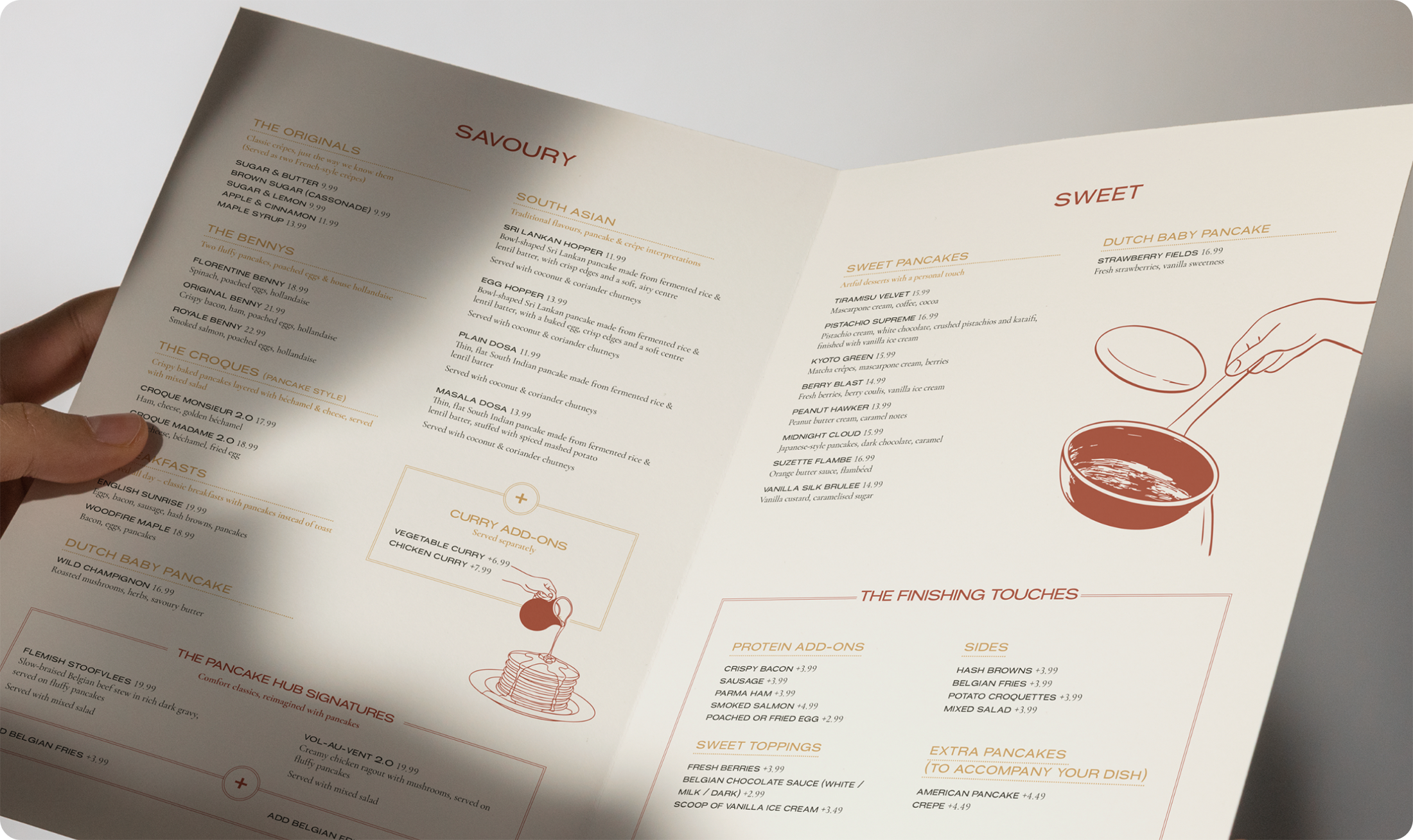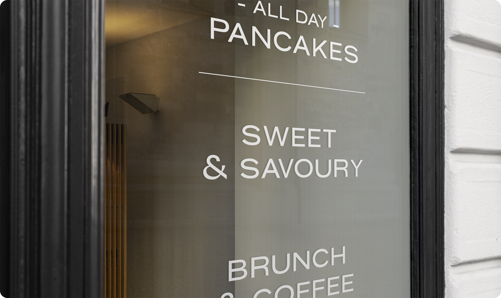 Om de branding echt te laten spreken, hebben we inspiratie gehaald uit de keuken voor het kleurenpalet. ‘Butter’, ‘Cream’ en ‘Caramel’ roepen associaties op met ahornsiroop, bloem en goudgeel gebakken pancakes, terwijl diepe groentinten zoals ‘Thyme’ zorgen voor een natuurlijk en kwalitatief contrast. Deze visuele warmte wordt ondersteund door een mix van de strakke Konstant Grotesk voor headlines en de elegante Cormorant voor de bodytekst. Van de menukaarten en handgetekende illustraties tot de raamstickers in de Antwerpse binnenstad; elk element dat we hebben uitgewerkt draagt bij aan een consistente beleving die laat zien dat hier met aandacht voor detail wordt gewerkt.