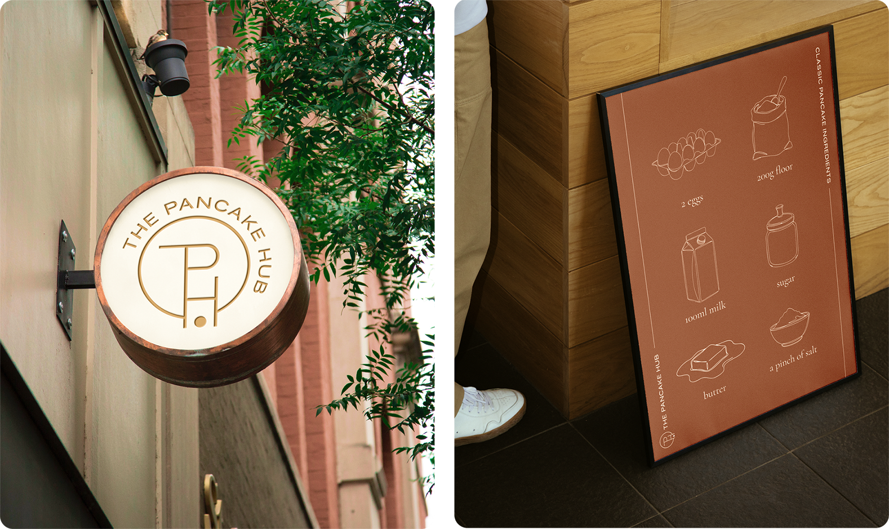 Begin 2026 opende The Pancake Hub haar deuren in hartje Antwerpen, en wij hadden het genoegen om vanaf de eerste dag de visuele koers mee te bepalen. Voor dit nieuwe all-day restaurant creëerden we een identiteit die net zo verfijnd is als hun brunchgerechten. Het logo staat centraal als een modern, circulair merk: de ronde vorm is een bewuste link naar de vorm van een pannenkoek en de pan, maar symboliseert ook de ‘hub’ als een centrale ontmoetingsplek. Met een strak monogram en speelse details, zoals een subtiele batter-splash, straalt het merk een perfecte balans uit tussen klassiek en luchtig.